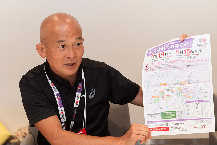 マラソンと競歩を担当し、主な仕事はコース設計です。マラソンコースはパリ五輪の代表選考会のコースをベースにする中で、全体の距離を短くして交通規制ルートを少なくしたり、世界陸連や放送局の要望を受けて東京駅前の馬車道を通したりして工夫を重ねました。最終的にコースの検定をして、警視庁や各町会の合意を得るところまでやるのが仕事です。